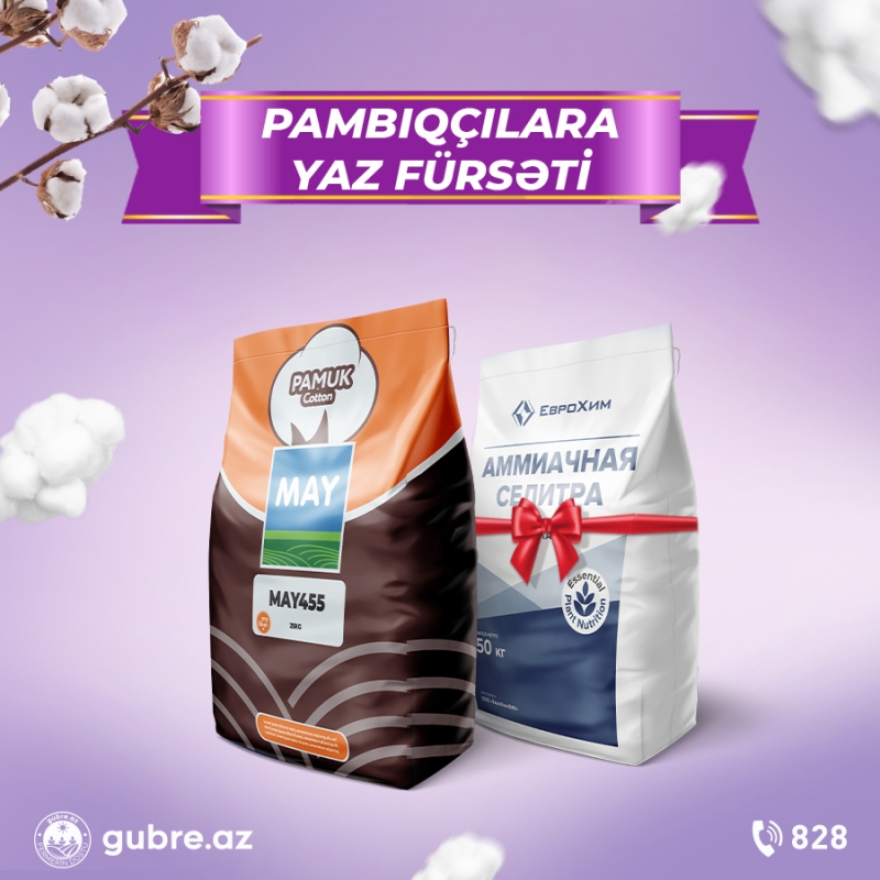 Fermerlərimiz “May-455” pambıq toxumlarını respublikanın bütün bölgələrində gubre.az satış nöqtələrindən 100% dövlət subsidiyası hesabına əldə edə bilərlər. Qeyd edək ki, gubre.az “Aqrar İnnovasiya və Təchizat Şirkəti” QSC-yə məxsus kənd təsərrüfatı istehsal vasitələrinin satış şəbəkəsidir.